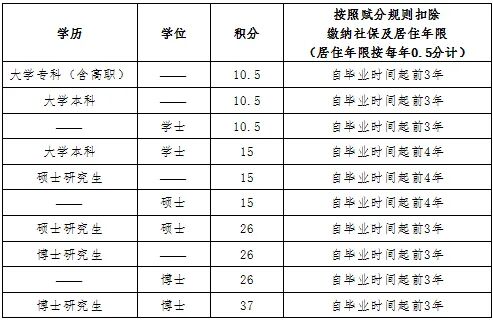 分別比照教育背景指標賦分規則,自畢業(yè)日期起,往前扣除相應年限內同時(shí)獲得的連續繳納社會(huì )保險年限及連續居住年限積分,期間獲得社保及居住年限積分不足規定年限的,按實(shí)際獲得年限扣分;未獲得社保及居住年限積分的則不予扣除。 |
